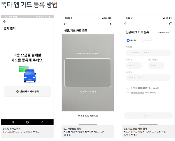 1. 결제 카드 등록 (신용 또는 체크카드 선택)