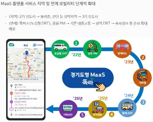 똑타는 새로운 'MaaS 플랫폼'을 도입·운영하여 기존의 교통수단(노선버스, 지하철)에 새로운 교통수단인 DRT, PM 등을 연결하고 출발지부터 목적지까지 최적의 이동 솔루션을 제공할 예정입니다. 즉, 경기도, 경기교통공사, 시·군, 민간 플랫폼 사업자, 운송사업자 등 공공과 민간이 협업하여 다양한 교통수단의 정보를 바탕으로서 최적의 경로로 예약·결제하는 사업 서비스인 거죠. 앞으로는 운영 지역과 연계 모빌리티를 이용하여 점진적 확대를 할 것으로 보입니다.