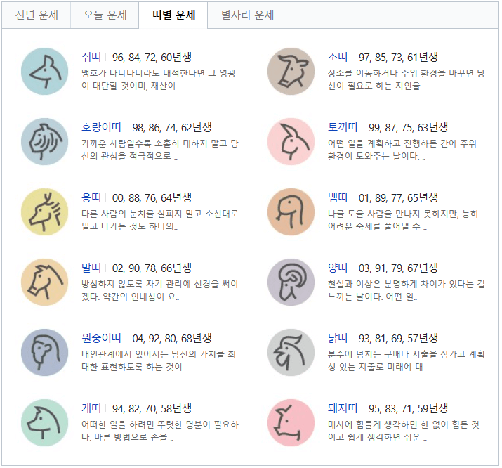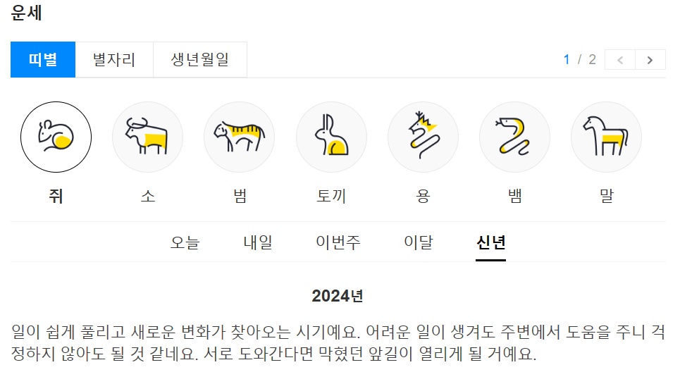 네이버에서 "신년 운세" 검색하여 바로 확인 가능하며 신년운세 (총운, 애정운, 금전운, 직장운, 학업 및 성적운), 오늘운세, 띠별 운세, 별자리 운세를 알 수 있습니다.