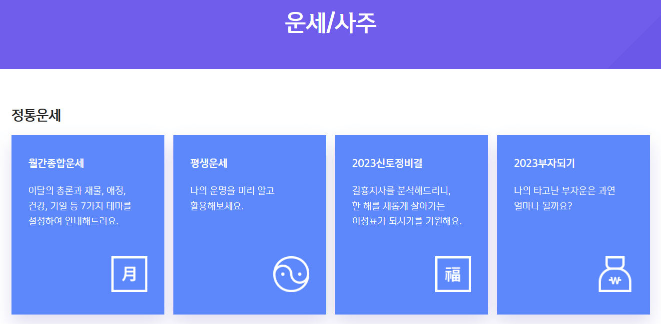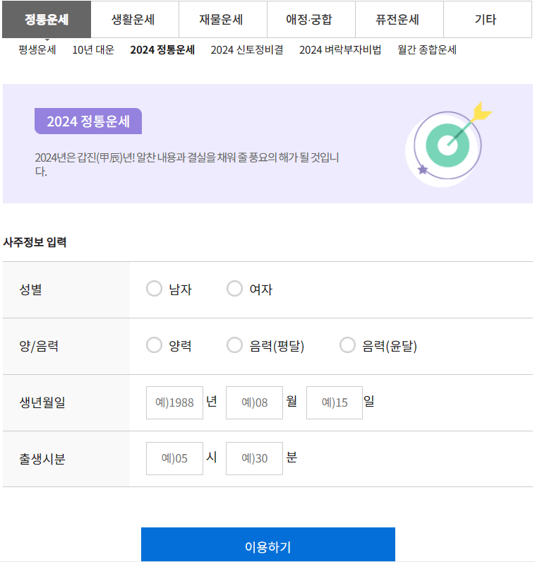 2024 정통운세, 신토정비결, 평생 운세, 월간 종합운세, 오늘의 운세 확인 가능합니다.