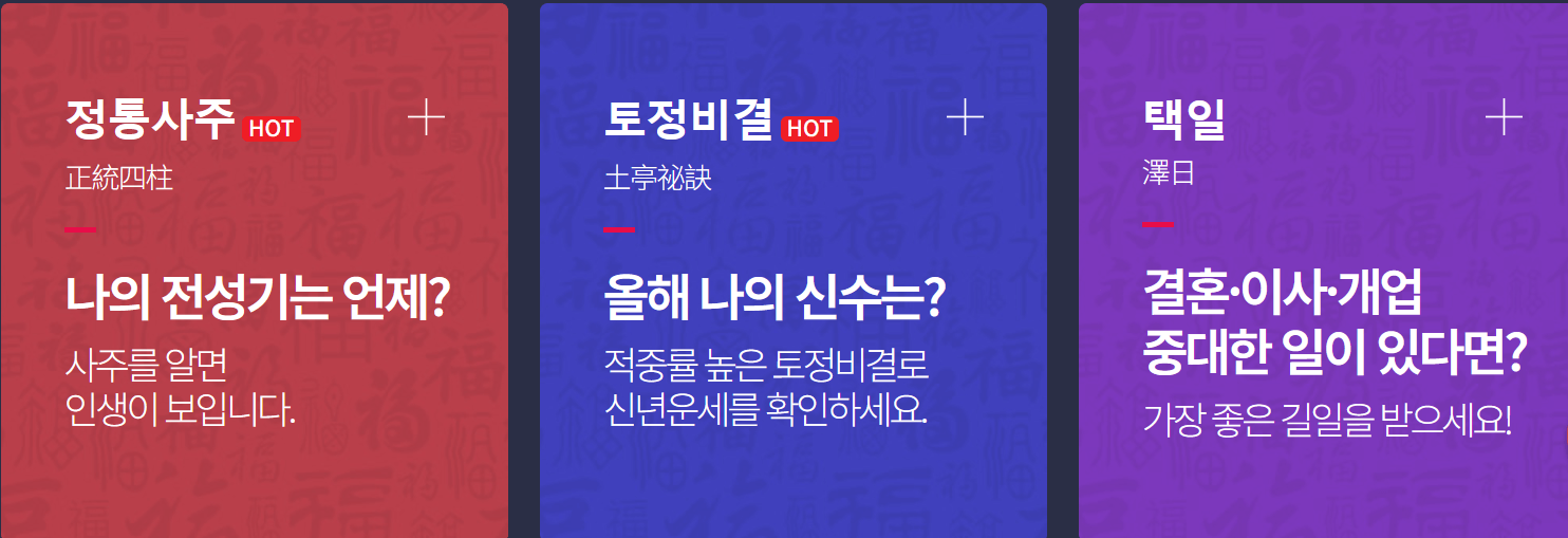 2024 신토정비결, 부자되기, 프리미엄 로또운세, 애정 궁합, 오늘의 타로 등 무료 이용 가능합니다.