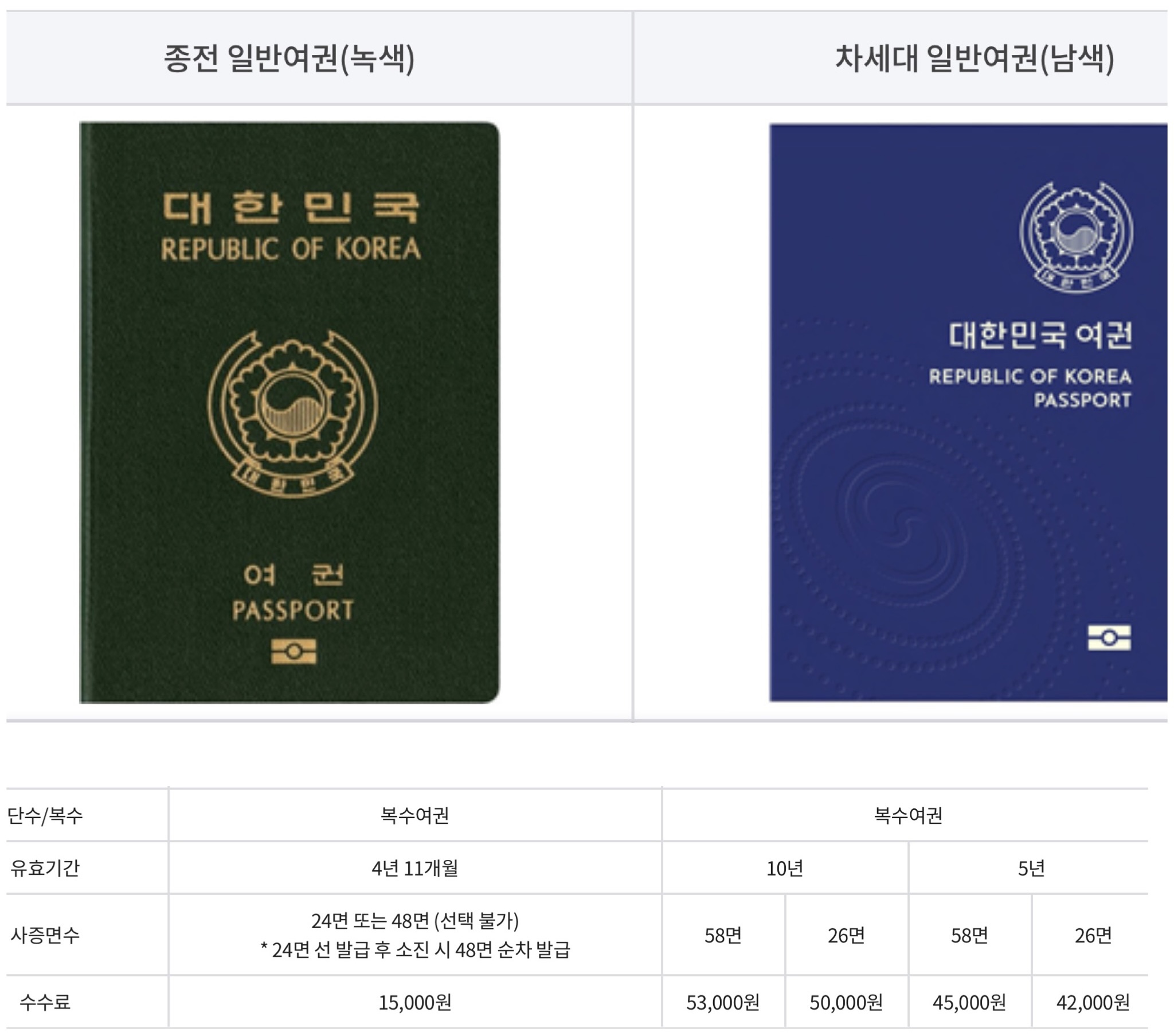 현재 기존 녹색의 일반 전자여권인 종전 일반 전자여권과 남색의 차세대 일반 전자여권 2종류이며, 1가지를 선택 발급받을 수 있습니다. ★작년 5월 31일부로 개시된 종전 여권 (유효기간 4년 11개월, 수수료 15,000원)은 재고 소진 시까지 발급 가능해요! 여러분 당장 계획에 없더라도 질러야 해요. 그리고 만 18세 미만의 아이를 가진 부모라면 무조건 종전 여권으로 만드는 것이 이득입니다. 미성년자라면 복수 여권은 최장 5년까지 가능해요. 종전 여권은 1개월 모자란 4년 11개월로 차이가 별반 없어요. ( 복수 여권 5년 미만의 만 8세 미만과 종전 여권 비교 시 모든 수수료를 포함한 비용이 30,000원으로 최소 50% 할인되는 셈이지요.