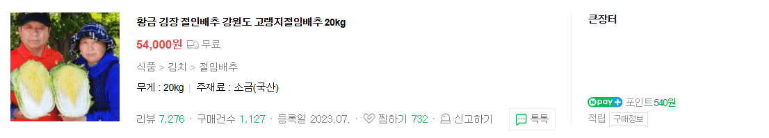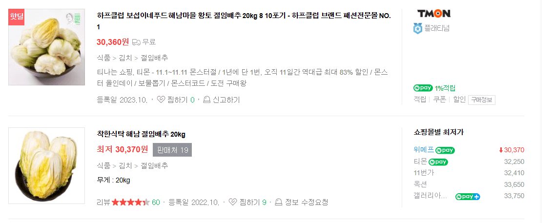 네이버 랭킹순 후기와 가성비 좋은 절임배추 20kg 기준 대략 30,370원 (무료배송)부터 54,000원까지 의 시세가 형성되어있네요.