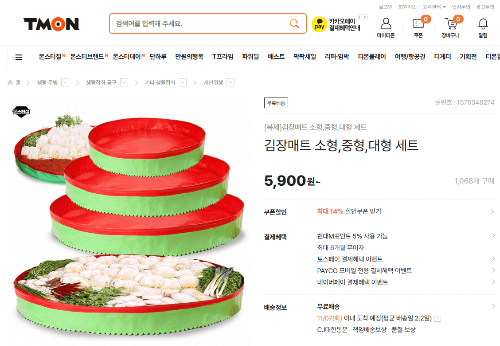 티몬에서는 김장 기 행사가 진행 중이며, 김장 준비에 필수인 김장 매트는 인터넷 배송료 포함 대형 (120cm 기준) 6,900원이면 저렴한 편에 속하네요. 다이소에 가면 5,000원 정도 선이니 편하게 집 앞 주문하기에는 괜찮아 보이는 가격인 것 같아요. 그리고 써도 써도 부족한 김장 비닐 (튼튼하고 질긴 소부터 드럼통까지 다양한 비닐 사이즈)과 함께 넉넉하게 구매 추천드려요.